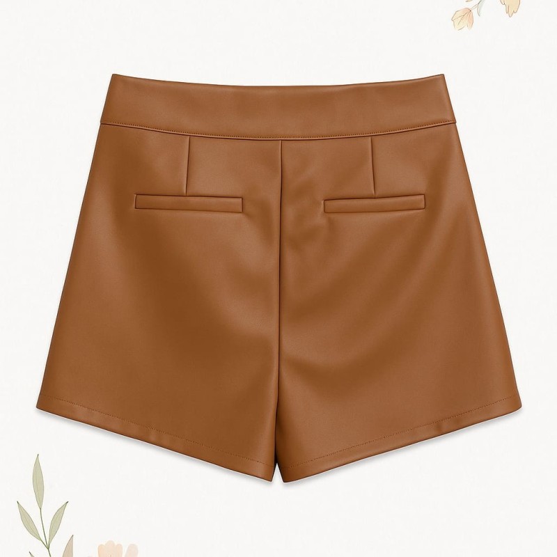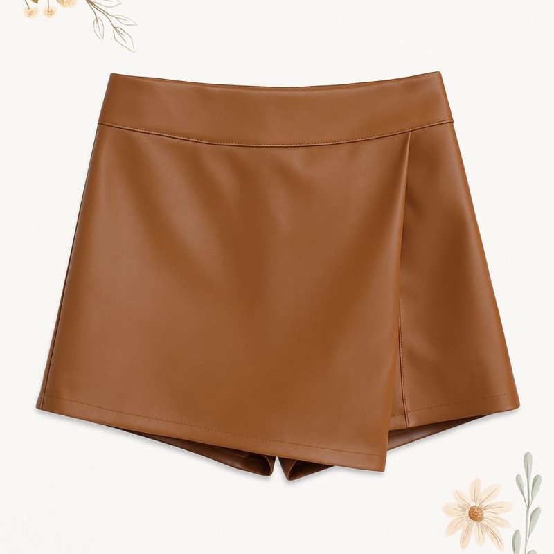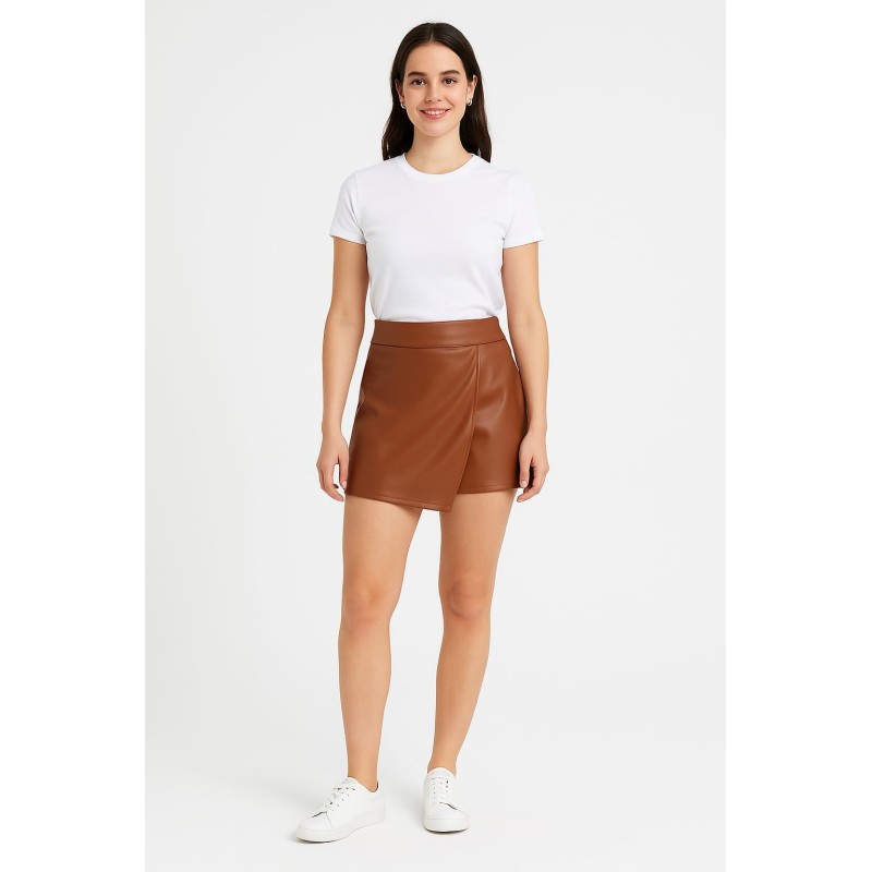 Una prenda moderna y práctica que combina la elegancia de una falda con la comodidad de un pantalón. Su acabado efecto piel en color camel le da un aire sofisticado, perfecto para crear looks tanto casuales como elegantes.