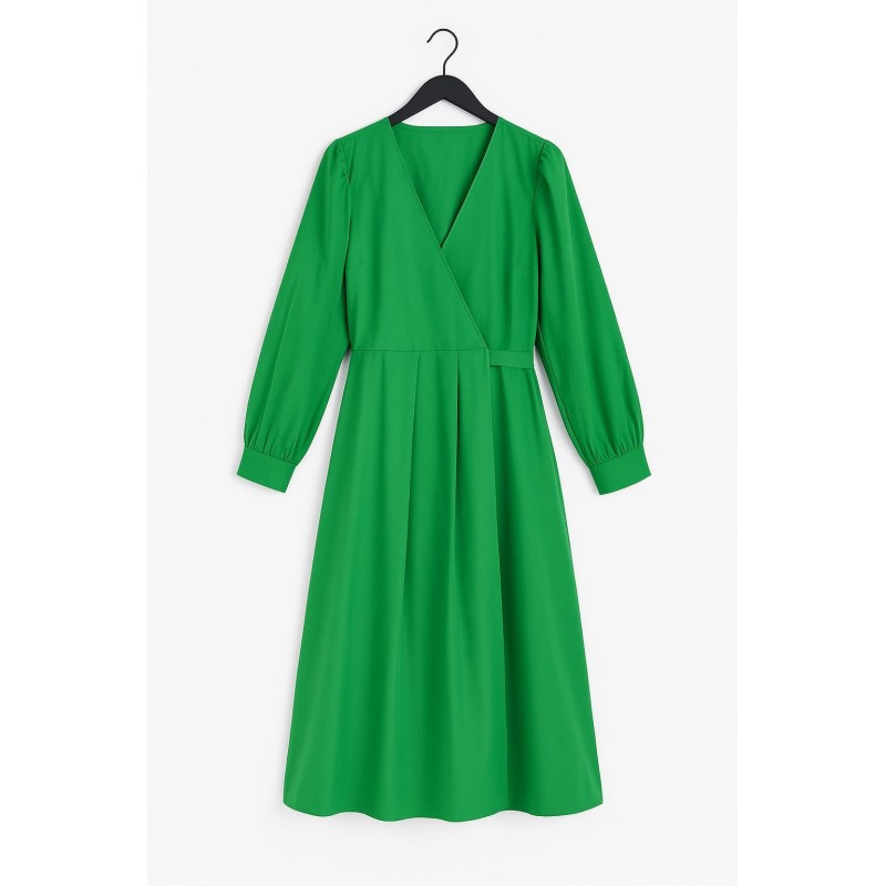 Presenta escote cruzado moderado, mangas largas ligeramente abullonadas, y un cinturón de la misma tela que se ata detrás para un ajuste cómodo y versátil. Perfecto para un look sofisticado tanto de día como de noche.