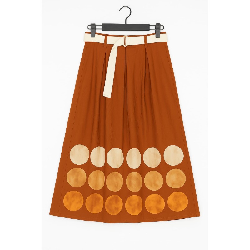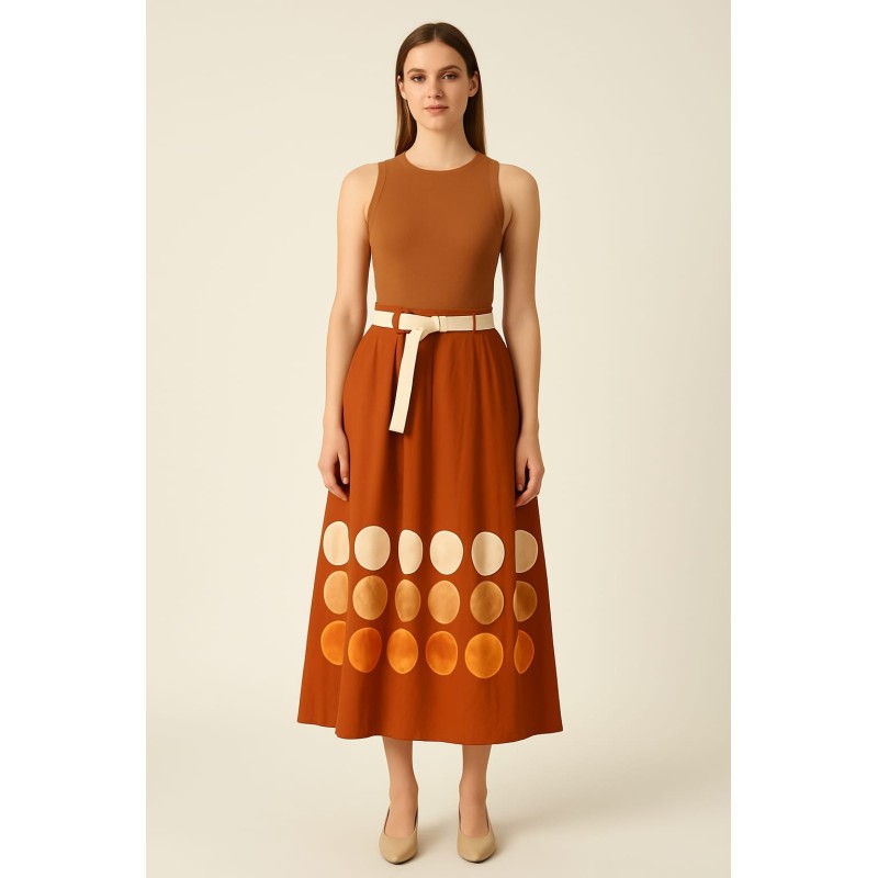 Falda midi de corte elegante en color teja con estampado circular en la parte inferior. Confeccionada en 95% algodón y 5% elástico, ofrece comodidad y suavidad al tacto.